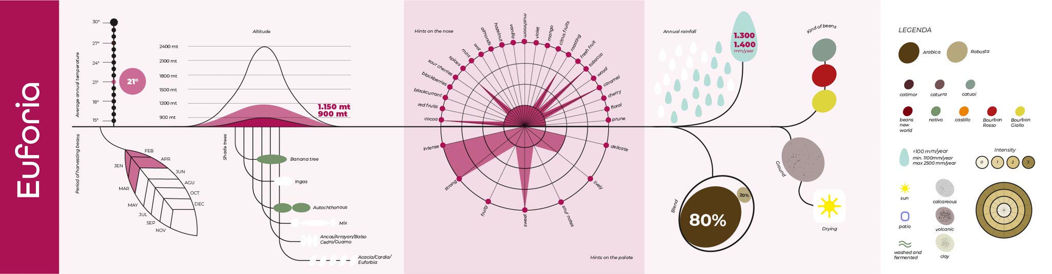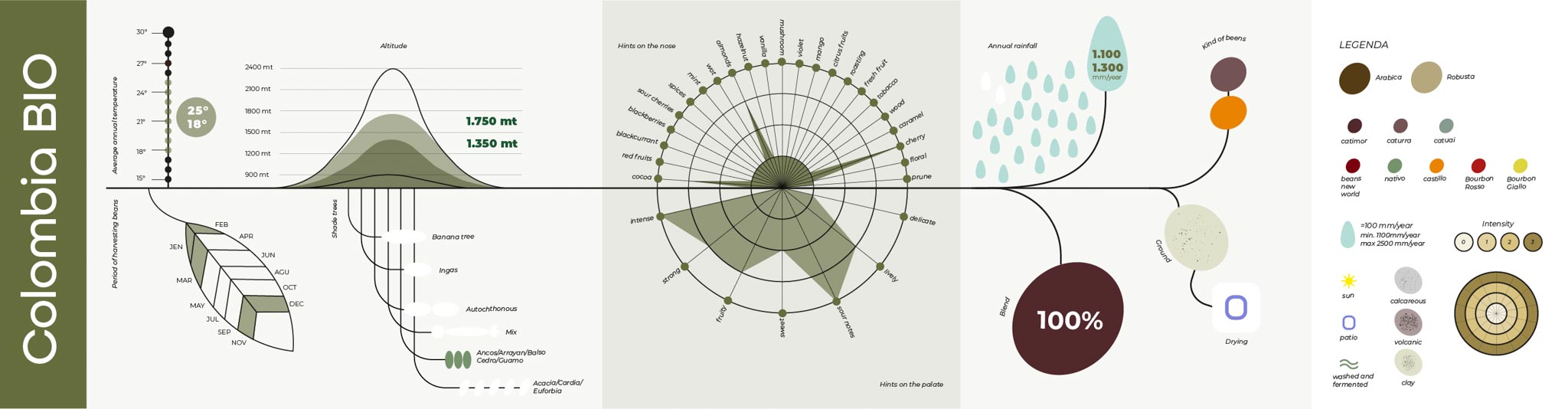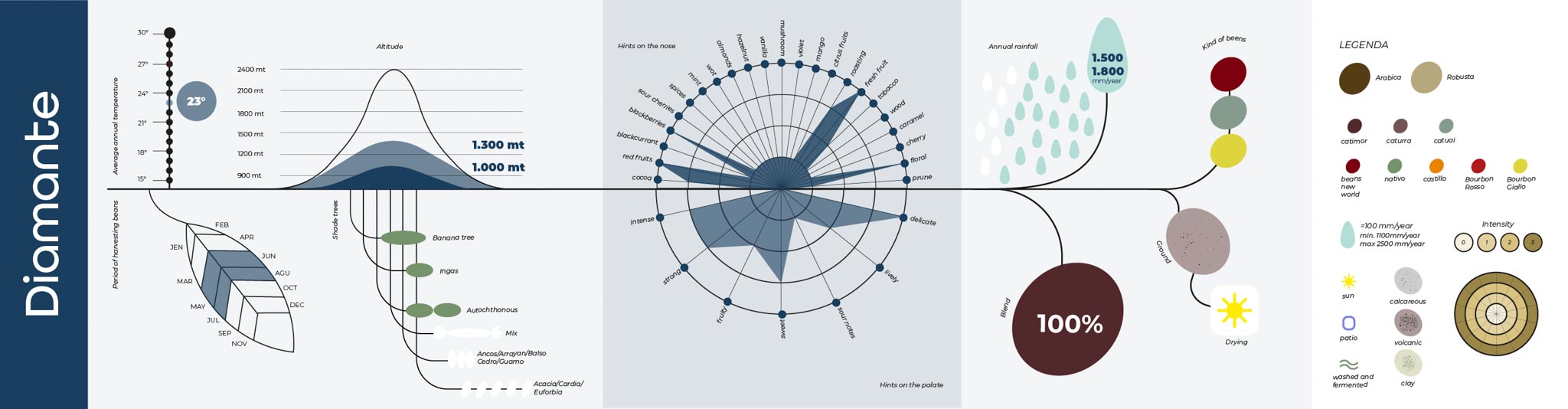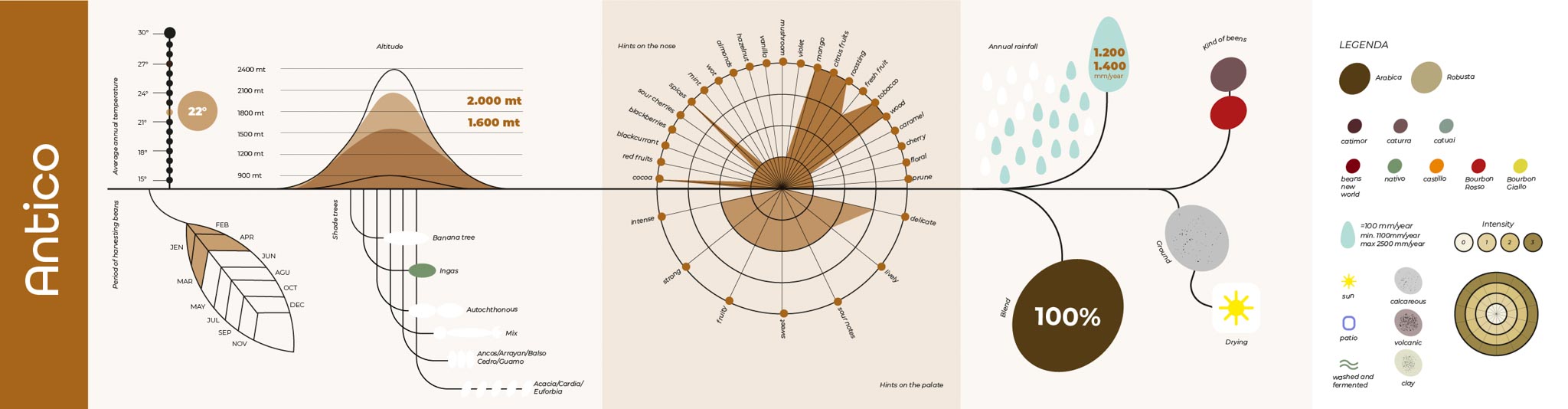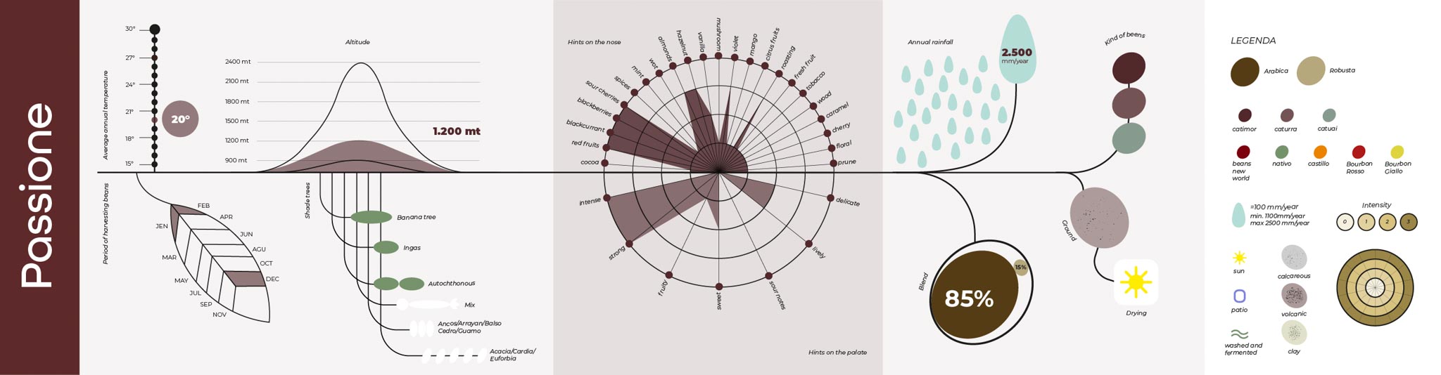Queste infografiche sono state realizzate per raccontare e descrivere le principali caratteristiche delle diverse tipologie di caffè, mettendone in evidenza origini, peculiarità e differenze in modo chiaro e immediato.